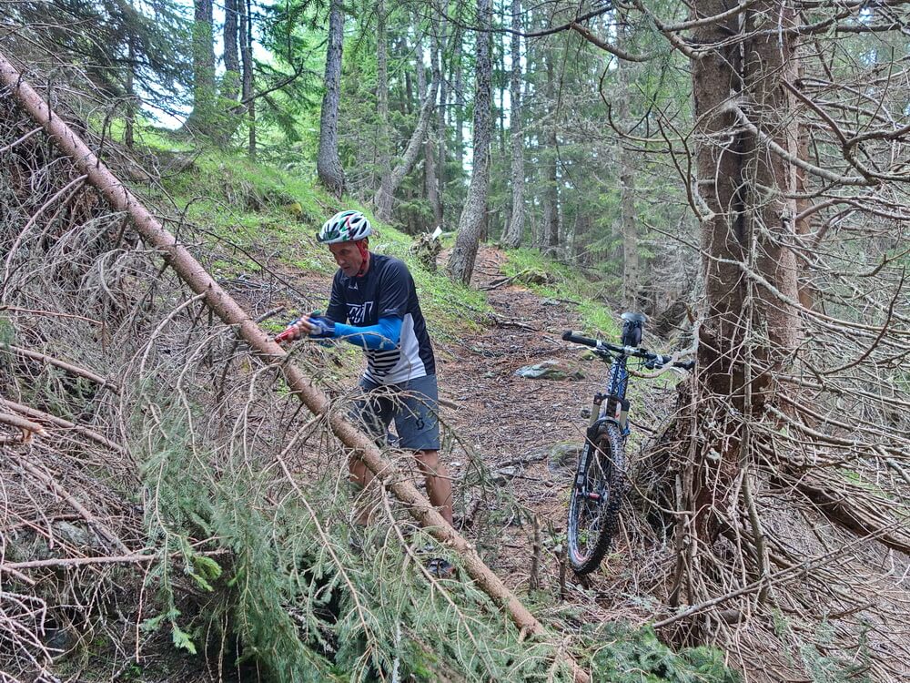 - den alten Steig von Serfaus hinunter nach Tösens bezeichnest Du im Roadbook als "netten kleinen Trail"; der Trail ist mittlerweile so was von ausgewaschen und auf feuchtes Stein- und Wurzelwerk reduziert, dass wir fast komplett bergab geschoben haben; gegen 5 Uhr nachmittags und mit langsam knurrendem Magen war das ein wenig frustrierend; wir sind gewiss keine guten Downhill-Fahrer ... dennoch wage ich die Prognose, dass dieser Steig von mindestens 80% der Transalpler mit Rucksack zu riskant und nicht mehr fahrbar ist.