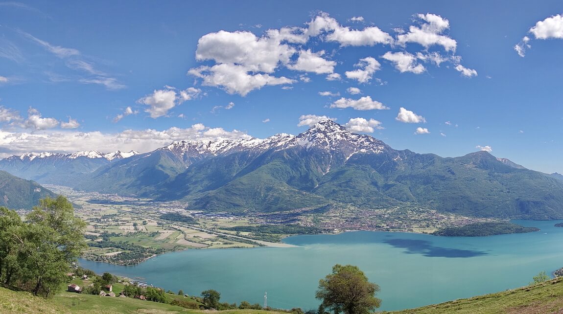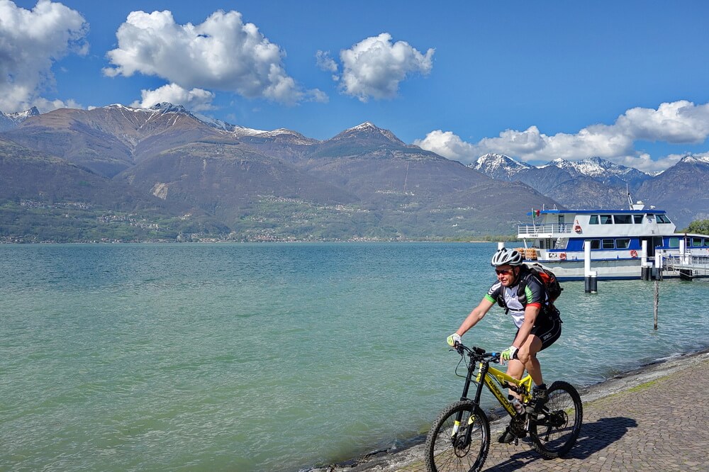 Flachstrecke von Morbegno auf dem Radweg des Sentiero Valtellina bis direkt an den Comer See. Man erreicht den See direkt an der Mündung der Adda in den See bei einer Badestelle. Da fällt es unter Umständen schwer, sich für die Bergetappe des 7. Tages zu entscheiden.