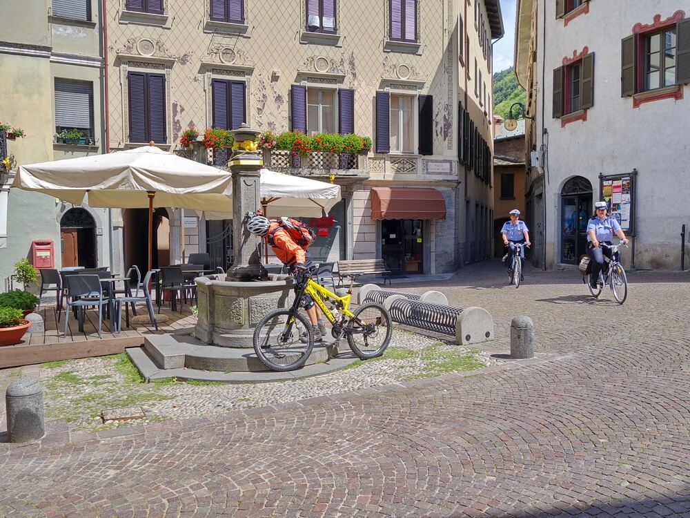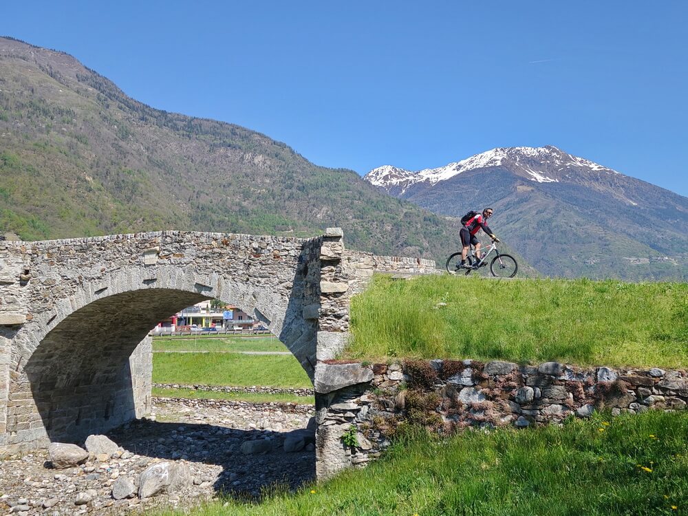 Als Übernachtungsort bot sich das Rifugio Bocchetta di Trona an. Von Grosotto sind es rund 95 Kilometer bei knapp 2000 Höhenmetern, da will ich sichergehen, dass wir dort auch eine Unterkunft bekommen. Eine telefonische Nachfrage bestätigt das: ja, kein Problem, unter der Woche ist fast immer Platz. Den Rest des Tages nutze ich, um das flache Teilstück von Morbegno direkt an den Comer See als alternative Variante zu erkunden. Die Strecke von Morbegno bis Colico verläuft fast komplett auf dem Radweg des Sentiero Valtellina und erreicht den Comer See direkt an der Mündung des Flusses Adda. Eine schöne entspannte Strecke. Damit war das auch geklärt. Am Morgen nach dem Ruhetag brechen Franco und ich nun zeitig auf. Die Strecke von Grosotto über Tirano und Sondrio verläuft in der Tendenz leicht bergab, eine lange Einrollstrecke also. Unterwegs treffen wir in Tirano an der Ponte Romana zufällig auf meinen Freund Bruno Raselli. Er führt im Valposchiavo ein kleines, aber feines Sporthotel. Im Zuge der Recherchen für meinen Alta Rezia Trailguide haben wir viele Touren gemeinsam unternommen. Am liebsten würde er heute mitkommen, aber die Pflicht ruft.