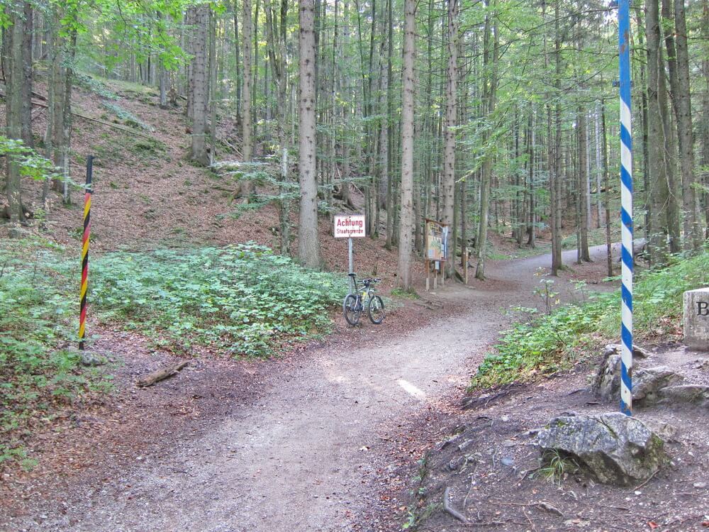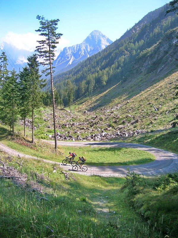 Das funktioniert bei einer Transalp eher nicht. Die erste Anstrengung für heute ist zum Glück gering, eine kurze Schiebepassage hinauf zur deutsch-österreichischen Grenze, an der die Leutasch beginnt. Dieses Hochtal ist im Winter eine beliebte Langlaufregion, da sie über viele Kilometer flacher Strecken verfügt. Entsprechend gering ist nun die weitere Anstrengung bis zum Gaistal, wo die eindrucksvolle Passage bis zur Zugspitze auf österreichischer Seite beginnt. Das Gaistal verläuft mäßig ansteigend bis zur Ehrwalder Alm. Eine Abfahrt folgt hinunter in den namensgebenden Ort. Hier sind viele Wanderer unterwegs, da es eine Seilbahn gibt. Die Wege werden deshalb etwas kanalisiert, damit es keine Konflikte zwischen den wandernden und radelnden Zeitgenossen gibt.