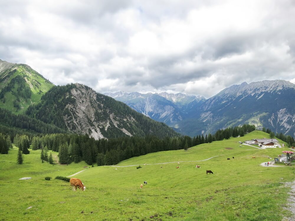 Noch vor dem Ortszentrum quert die Route hinüber zum Panoramaweg. Aha, den kenne ich doch - meine Albrecht-Route verläuft dort entlang. Allerdings bleibe ich nicht lange auf der bekannten und viel gefahrenen Strecke. Hinter Biberwier, noch vor dem Weißensee, biege ich links ab in Richtung Marienbergjoch. Das ist ein Übergang, den ich noch nicht kenne. Er liegt auf einer Höhe von 1789 Metern. Die Auffahrt von Biberwier, das auf einer Höhe von ca. 1100 Metern liegt, ist recht zäh. Auf einer Strecke von rund sechs Kilometern ergibt die Höhendifferenz eine durchschnittliche Steigung von 14%. Obwohl die Auffahrt bis oben auf einer Schotterpiste stattfindet, wird sie für die meisten wohl nicht komplett fahrbar sein. Es warten zum Schluss ein paar fiese Rampen, mit um die 20% Steigung. Das ist mit einem Transalprucksack auf dem Rücken kaum fahrbar, aber gut schiebbar. Wer den inneren Schweinehund überlisten will, stiehlt sich in Biberwier klammheimlich zur Seilbahn, die auch im Sommer läuft und Fahrräder mitnimmt. Psst, braucht man ja niemandem zu erzählen. Wie auch immer man das Marienbergjoch bezwungen hat, bei der Abfahrt wartet zur Belohnung die Marienbergalm, ein schöner Rastplatz mit Ausblick.