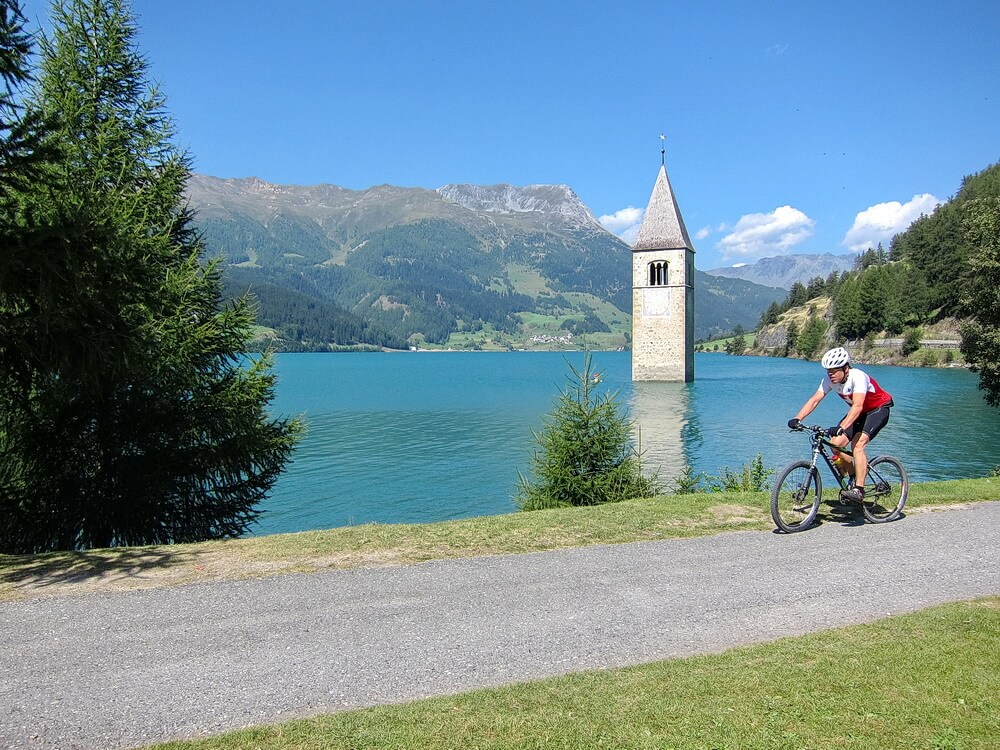 Der Radweg führt uns in Nauders wieder einmal an einem M-Preis vorbei, perfekte Zeit und perfekter Ort für eine Rast. Heute steht uns noch einiges bevor, da brauchen wir eine Stärkung. Wir suchen uns einen schattigen Platz auf der Terrasse. Erstaunlich, was in der halbstündigen Pause an Radlern an uns vorbeizieht. Tourenradler, Mountainbiker, Rennradler und E-Biker - ein bunt gemixtes Völkchen. Bis zum Reschenpass und entlang des Reschensees werden wir die Strecke mit ihnen teilen. Erst am Haidersee verlassen wir beide die Via Claudia und sind schlagartig wieder allein unterwegs. Eine Forstpiste führt uns stetig in die Höhe in Richtung Pfaffensee. Bald sind wir über der Baumgrenze. Die Sicht ist fanstatisch. Der Ortler liegt mit seiner Schneehaube gegenüber auf der anderen Talseite. An einer Wegbiegung treffen wir auf ein paar einheimische Forstarbeiter. Sie haben ein Fernglas dabei und reichen es uns. Auf dem Ortlerplateau ist doch tatsächlich deutlich die Trampelspur des Normalweges von der Payerhütte zum Gipfel zu sehen. Bei dem guten Wetter herrscht dort oben ein reger Betrieb.