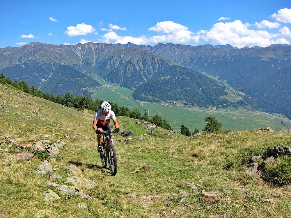 opner 350 opner IMG 2932Wie schon bei der Via Crux Albi nutzt Dirk seinen Familienurlaub in Südtirol, um mich auf einem Abschnitt meiner Transalp zu begleiten. Das geschieht bei einem Schönwetterfenster, um mit leichtem Gepäck oder gar keinem unterwegs sein zu können. In Kombination mit seinem auf extremen Leichtbau getrimmten Cannondale ist er mir bergauf natürlich haushoch überlegen. Aber darauf kommt es nicht an. Wichtig ist, dass wir heute eine sehr eindrucksvolle, alpine Etappe gemeinsam fahren werden. Die Strecke hatte ich schon vorher ausgetüftelt. Heute fahren wir sie bei bestem Wetter am Stück. Los geht es in Pfunds mit einer lockeren Einrollstrecke ab Pfunds auf dem Innradweg bis zur Kajetansbrücke. Hier gibt es einen Radweg flussaufwärts entlang des Inns. Dadurch können wir ein Stück der Straße nach Martina in der Schweiz vermeiden. In der Nähe des alten Innübergangs Altfinstermünz müssen wir dann doch auf die Straße wechseln. Der Inn hat hier einen Canyon in den Fels gegraben, an dessen Rand beim besten Willen kein Platz für einen Pfad ist. Zügig rollen wir nach dem Ort Vinadi hinunter nach Martina. An der Schweizer Grenzstation interessiert sich für uns Mountainbiker kein Mensch. Mit einem Kopfnicken werden wir durchgewunken. Die Straßenvariante über die Norbertshöhe nach Nauders verkneifen wir uns heute, wir wollen uns ein wenig mehr quälen. Dazu wählen wir die steile Auffahrt von Sclamischot in Richtung Nauders. Im kleinen Ort verlassen wir also den Innradweg, es geht auf der MTB-Route bald straff bergauf. Im Bereich der grünen Grenze zwischen der Schweiz und Österreich gibt es einen kurzen Trailabschnitt, ehe wir wieder auf einer Schotterpiste in Richtung Mösle rollen. Hier gibt es wieder einen kleinen Trail, der uns auf der Straße kurz vor Nauders ausspuckt. Die Via Claudia hat uns wieder.