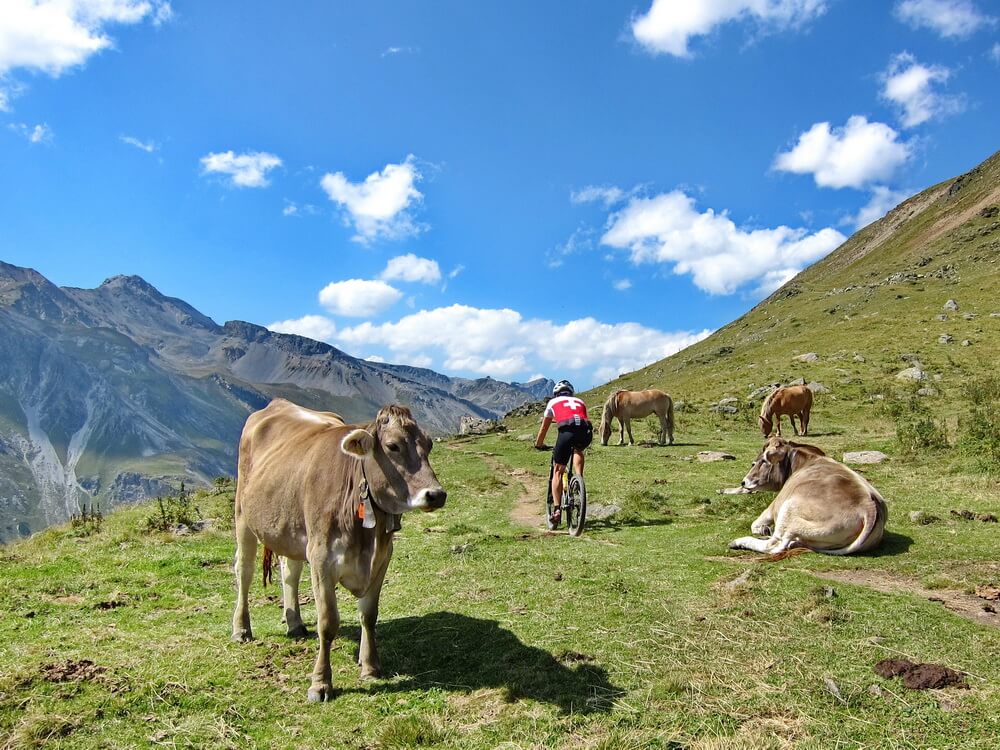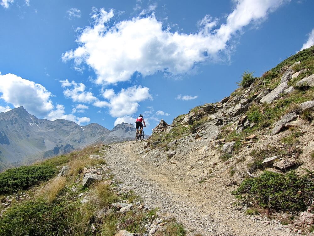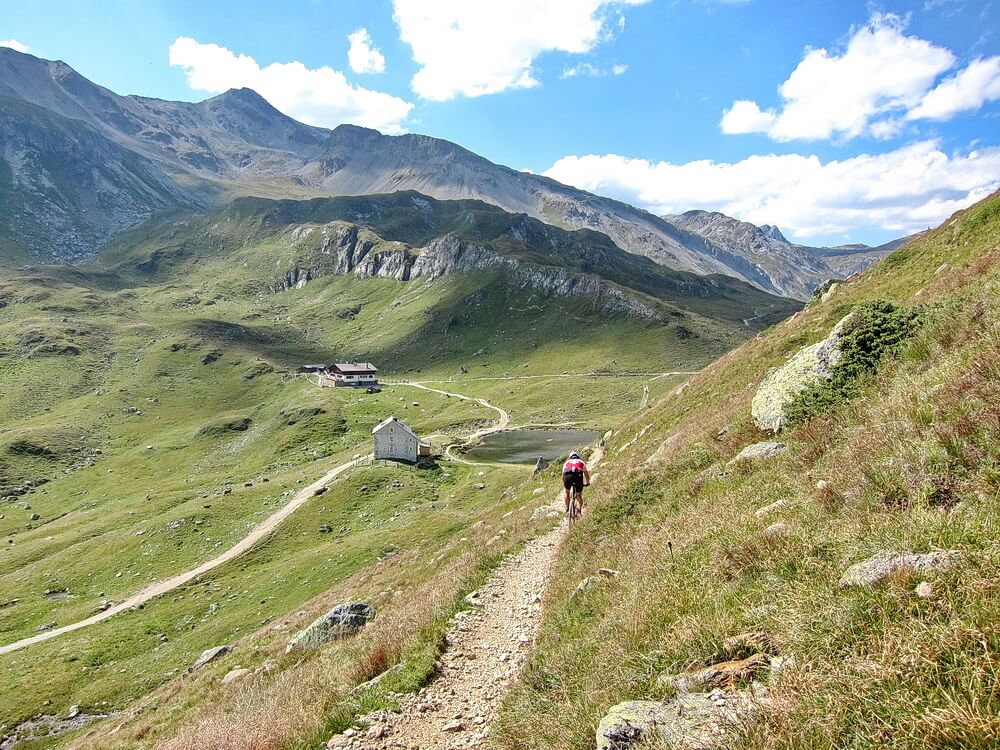 Wir haben uns inzwischen weiter nach oben geschraubt und passieren die Pfaffenseen. In der Nähe der Plantapatsch-Hütte gelangen wir auf den Höhenweg, der sich zur Sesvenna-Hütte hinzieht. Wir befinden uns hoch über dem Schliniger Tal. Da hier ein Lift Wanderer in die Höhe befördert, muss man bei gutem Wetter mit einigen Wanderern auf der Strecke rechnen. Mit der gebotenen Rücksicht sollte es keine Probleme geben, zumal man das Rad bei einigen kleinen Gegenanstiegen schieben muss. Der Weg zieht sich schon hin, das Panorama entschädigt für die kleine Mühsal. Schließlich erreichen wir die Sesvenna-Hütte am späten Nachmittag. Mein Tagesziel für heute ist erreicht. Dirk fährt noch ins Tal ab, ins Urlaubsdomizil seiner Familie. Morgen will er in aller Frühe wieder da sein, um mit mir gemeinsam das Val d'Uina zu durchqueren.
