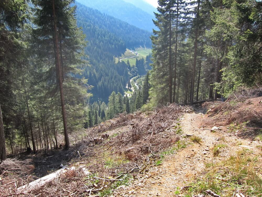An der Ponte Conseria beginnt nun leider schon der geteerte Fahrweg. Wer ein paar wenige Höhenmeter nicht scheut, kann noch nach links zur Malga Caserine queren und ein wenig Schotterpiste mitnehmen. Der GPS-Track bildet diesen Weg ab. Am Rifugio Carlettini ist dann aber endgültig Schluss und man muss auf der Teerstraße ins Tal rollen. Aus einer Eingebung heraus finde ich dann noch einen interessanten Abzweig. Ungefähr 5 Kilometer nach dem Rifugio Crucolo (auch hier könnte man übernachten) gabelt sich die Straße in sehr spitzem Winkel. Halblinks ist ein kleiner Holzwegweiser, auf dem steht: Strada de Sciapaor (erkennbar auch an einem Verkehrsschild "Beschränkung auf 10 t"). Das ist zwar kein Trail, unterwegs finden sich dafür ein paar Katzenkopfpflasterabschnitte und man umgeht die Straße, die über Spera führt. Viel Verkehr ist zwar auf dieser Strecke nicht zu erwarten, aber immerhin.