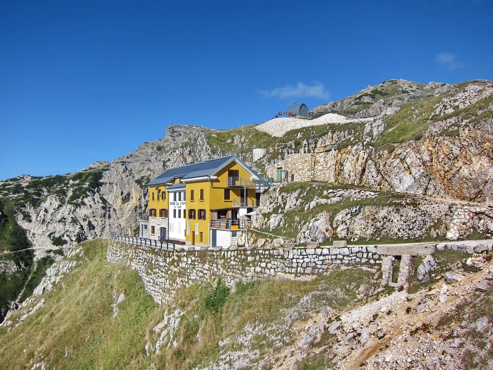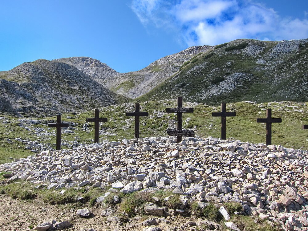 Grande Finale: große Bühne Pasubio und wieder ein unglaublich klarer Tag. Oft hängt man hier oben in einer Nebelsuppe und sieht rein gar nichts von der Landschaft. Auf jeden Fall ist es nach einem ordentlichen Frühstück in Posina erst einmal eine Fleißaufgabe, hier überhaupt anzukommen. Aber ich habe mir das vorgenommen, also schaffe ich das diesmal auch. Bei einer großen Aufgabe hilft es, sich kleine Teilziele zu stecken. Zuerst ca. 500 hm auf Teer zum Colle Xomo - geschafft. Dann zum Beginn der Strada della Galeria - keine 200 hm, lächerlich. Nun die Strada degli Scarubbi, rund 700 hm bis zum Rifugio Papa - geht noch. Was?! Schon da, klasse. Hier nur kurz reingeschaut, Fotos gemacht und weiter bei dem schönen Wetter. Die Setti Croci sind eigentlich sieben Kreuze, wieso fehlt da auf dem Bild eines?