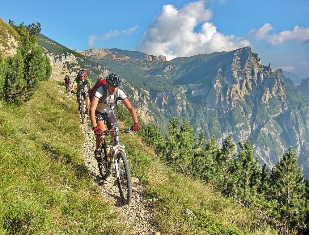Und dann aufgepasst! An der Selletta del Groviglio nicht den verführerisch bergab führenden Weg 120 nehmen, sondern links den Trail Nr. 105 noch ein paar Meter bergauf schieben. Das wars dann aber auch im wesentlichen. Oben entspannt sich die Lage. Beim 120er weiß ich aus eigener leidvoller Erfahrung, dass der zwar auch zum Rif. Lancia führt, aber mit einigen Auf und Abs eher eine Wanderung im Heckmairischen Sinn ist: Transalp ist Bergwandern, nur dass man ein Mountainbike dabei hat.
